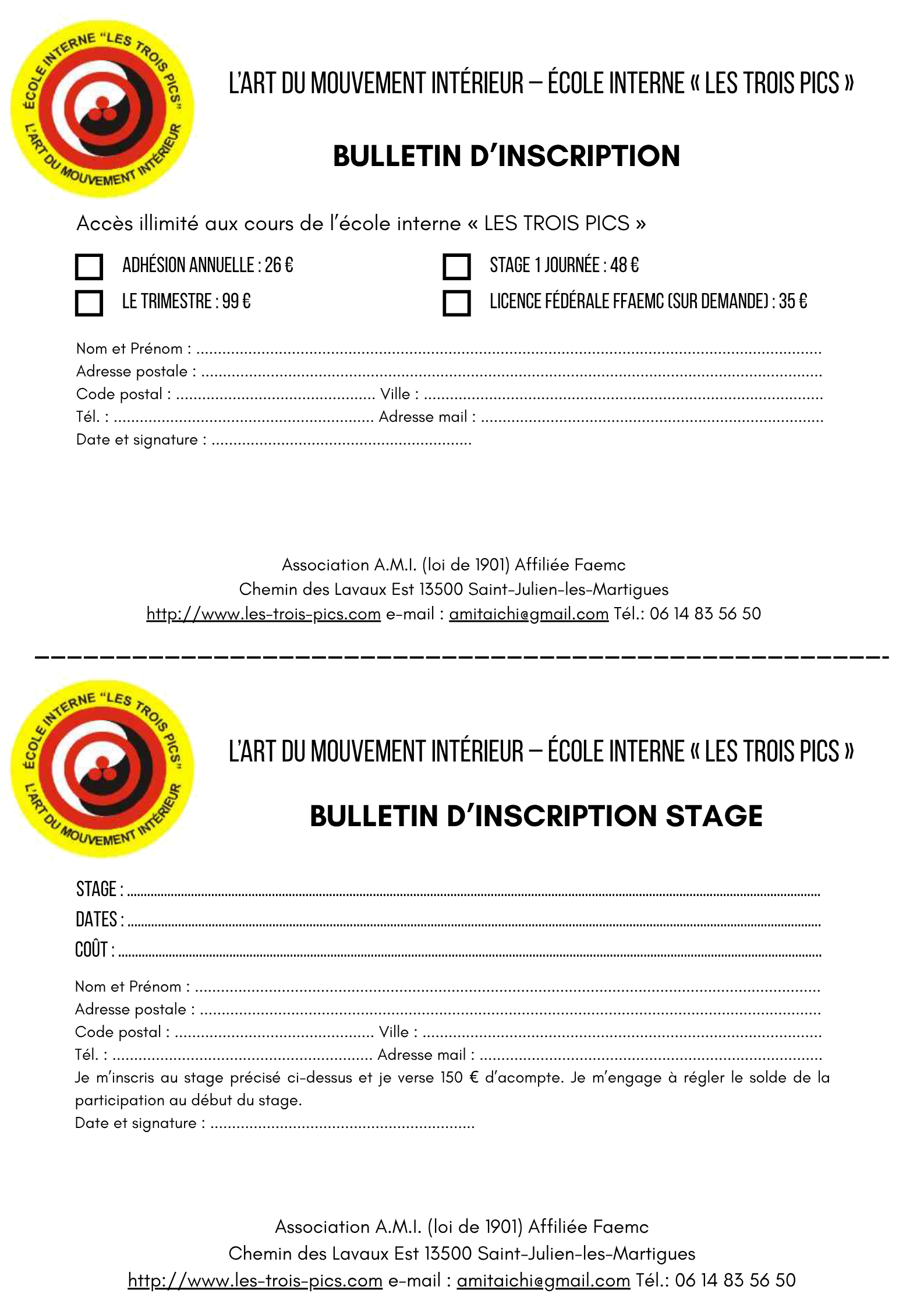Pour toute question, information ou demande d’inscription, contactez-nous par mail ou téléphone. Le bulletin d'inscription (cours à l'année ou stage) est téléchargeable ici.